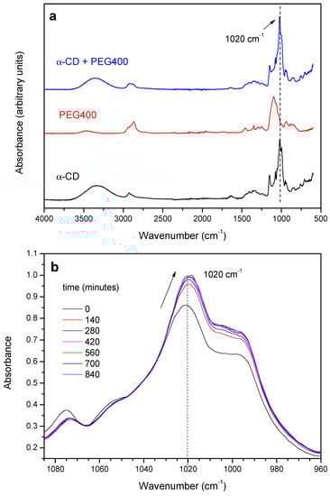 (a) FTIR-ATR spectra of α-CD, PEG400 and the reaction product after 120 min at 65 °C (1:1 feed ratio); (b) Expansion of the 960–1100 cm−1 region of the spectra an evolution with time.