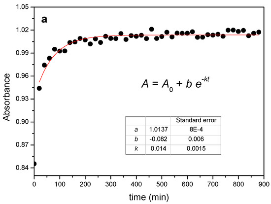 Figure 12a shows the FTIR kinetic profile of the reaction with L62 (1:5 molar ratio), with its corresponding curve fit. The reaction proceeds at a considerably lower rate than the one with PEG400, at the same ratio EO/CD and similar temperature (kth = 3.8 × 10−3 min−1, versus 9.6 × 10−3 min−1 for PEG400, Table 1). Likewise, the pre-exponential factor of the fit, which can be interpreted as a relative measure of the extension of the reaction (Figure 2), indicates that the formation of PPR is clearly less efficient (b = 0.016 for L62 versus 0.081 for PEG400).