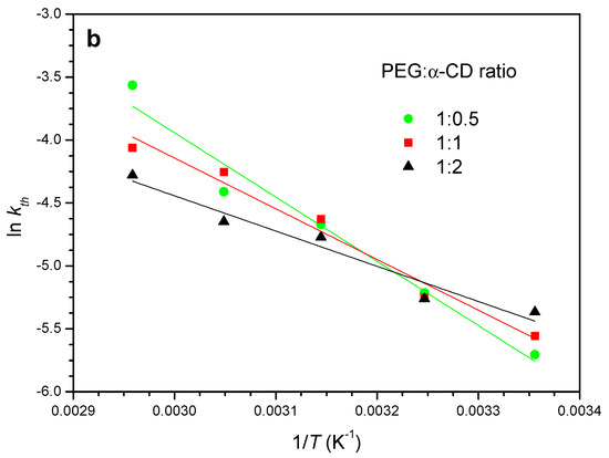 The reaction between the α-CD and PEG results in the gradual increase of the absorbance of the C-O stretching mode of the macrocycle at 1020 cm−1 and in a slight red-shift of ca. 3 cm−1, with the occurrence of an isosbestic point at ca. 1040 cm−1, as shown in Figure 1b. The relatively small changes observed are in line with the formation of a non-covalent structure stabilized by van der Waals forces, in which the EO monomers replace the water molecules included in the CD. The evolution of the absorbance of the 1020 cm−1 band of the α-CD has been tracked as a function of time and temperature. As an example, Figure 2a shows the kinetic profile of the 1:1 mixture at 55 °C. The experimental data have been fitted to an exponential decay function with offset (see Supplementary Materials—Numerical analysis of FTIR and XRD data), from which the rate constant of threading, kth, can be obtained (Table 1).