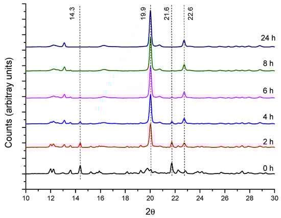 XRD patterns for PEG400:α-CD reaction (1:0.5 feed) at 50 °C as a function of time.