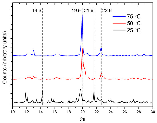 The temperature effect in the crystal formation is shown in Figure 4, which contains the diffractograms for the 1:1 mixture after 24 h. The 19.9° and 22.6° peaks of the PPR are more intense in the reactions at 50 and 75 °C, while the 14.3° and 21.6° ones (α-CD) are the weakest at these temperatures. At 25 °C, only small changes in the intensity of the peaks can be observed at any molar ratio (Figure S3). The ratio between the intensities of the reflections at 19.9° (PPR) and 14.3° (α-CD) can give an idea of the relative progression of the formation of crystalline PPR and helps to better compare the effect of the temperature and reaction feed in this second step (Figure S4). Clearly, the temperature favors the crystal formation rate, an effect that is more accentuated at lower CD proportion.