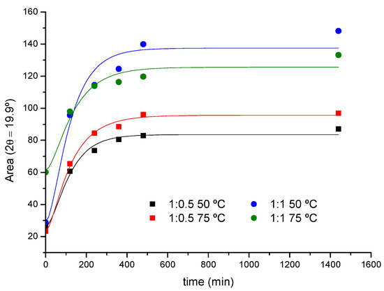 The rate constants of crystallization, kc, have been calculated for the 1:0.5 and 1:1 reaction feeds at 50 and 75 °C (Table 2), conditions for which the changes in the diffracted intensity permitted a more robust numerical analysis. To this effect, the areas of the 19.9° peak have been fitted to a modified form of Equation (4), introducing as a fixed parameter the value of kth previously obtained from FTIR in each case (see Supplementary Materials for details).
