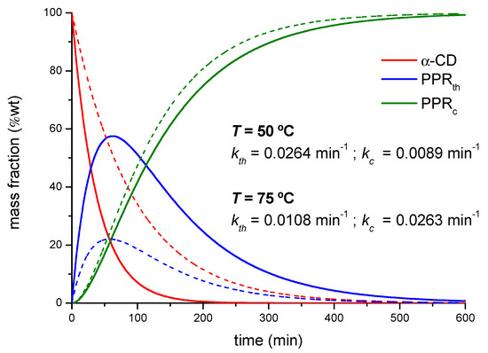 The kc values remain within the same order of magnitude as the threading constants but follow an opposite trend with the temperature. The threading process has been modeled as a first-order elementary reaction and, as such, the temperature increases the rate constant according to the Arrhenius law, as a difference to the subsequent packing of PPRs, which will be hampered by the thermal agitation of the system. The yield of the overall reaction in terms of PPRc formed will thus depend on the balance of both factors. According to the experimental rate constants obtained by XRD and FTIR, Equations (1)–(4) can be used to simulate the composition of all the species along the reaction (Figure 6). Under the experimental conditions used, the time of maximum concentration of intermediate (PPRth) is ca. 60 min in average for both temperatures and feed ratios.