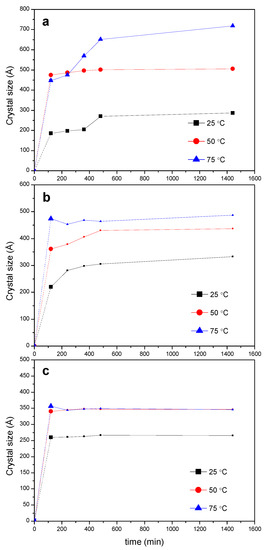 Relevant information on the evolution of crystal sizes overtime of the PPRc can be extracted from the Debye–Scherrer equation (Equation (1)), applied to the intense reflection at 2θ = 19.9°, as shown in Figure 7. The size of the crystals depends on temperature, time and feed ratio PEG:CD. A significant increment in crystal size occurs in the first hours of the kinetic run, reaching the highest value for the 1:0.5 mixture at 50 °C and 75 °C (Figure 7a). The temperature favors the growth of the crystals at any feed ratio (the little advance in the crystal formation at 25 °C is also reflected in the crystal size plots, the crystals showing the lowest sizes for a given PEG:CD ratio at such temperature). For the 1:2 feed (Figure 7c) the maximum size is reached at lower times, at any temperature, being the crystals the smallest, in agreement with the lowest conversions in PPRc observed (Figure S4). The lower rate constant of the threading step for this ratio (Table 1) may be in the origin of this behavior, to which contributes the effect of a thicker reaction medium that hampers the further PPR packing and, therefore, the crystal growth.