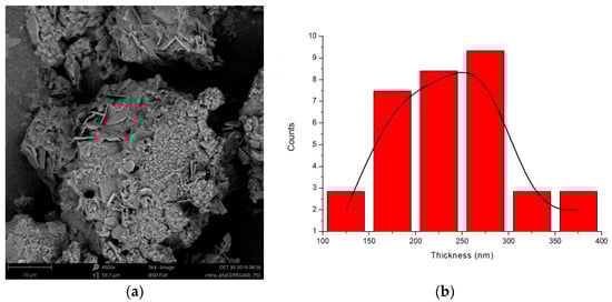 (a) SEM micrograph of the reaction of PEG400 and α-CD (1:2 molar ratio) at 75 °C (BSE electrons, 4500×, 5 kV); (b) Thickness distribution of the lamellae.
