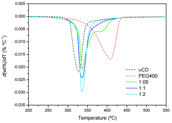 DTG curves of PEG400, α-CD and the products formed after the reaction for 24 h at 75 °C (1:0.5, 1:1 and 1:2 PEG400:α-CD molar ratios).