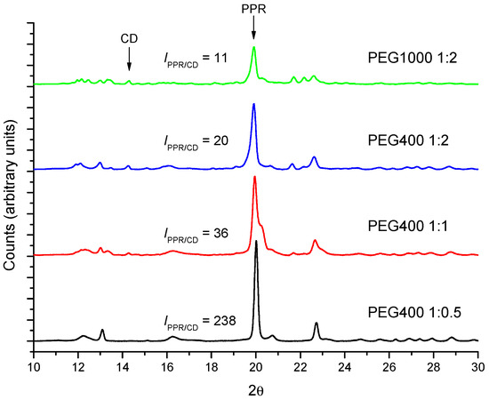 In CD-based PPRs, the arrangement of the macrocycles along the axis polymer and further packing produces channel-like structures with characteristic reflections in the powder XRD patterns, which are markedly different from the crystalline structure of the CD [14,37]. This is the case of the reaction of α-CD with PEG400 (Figure 3). The X-ray diffractograms show the reduction of the intensities of the reflections of the CD (2θ = 14.3 and 21.6°, cage-type structure), while those of the crystalline PPR (19.9 and 22.6°) increase. This same behavior is observed with 1:1 and 1:2 feed ratios (Figures S1 and S2).