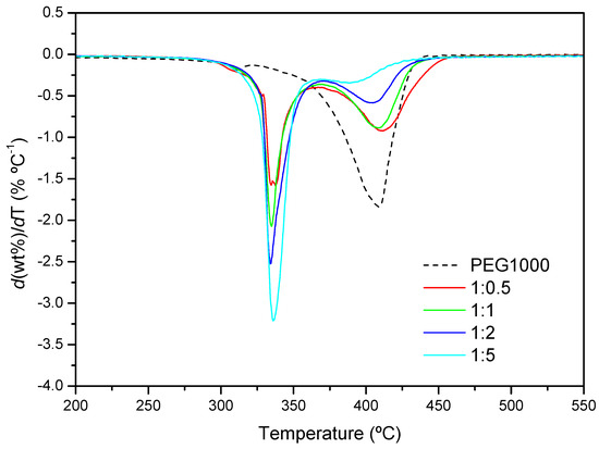 DTG profiles of PEG1000 and the product formed after 24 h at 50 °C (1:0.5, 1:1, 1:2 and 1:5 molar ratios).