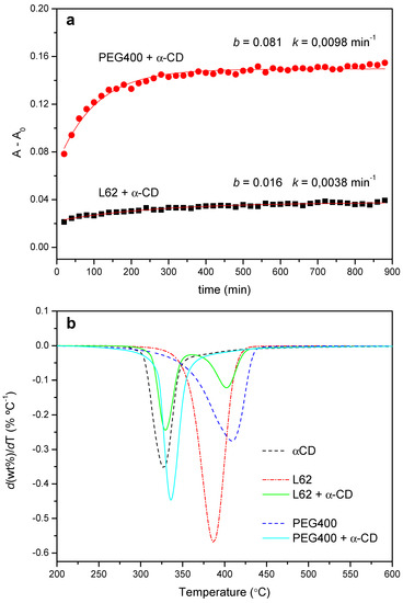 (a) Kinetic profiles for the reaction between L62 and α-CD (1:5, 50 °C) and PEG400 and α-CD (1:2, 55 °C). (b) DTG curves obtained from the PEG400 and L62 reactions with α-CD (1:2 and 1:5 feeds, respectively) after 24 h at 50 °C.
