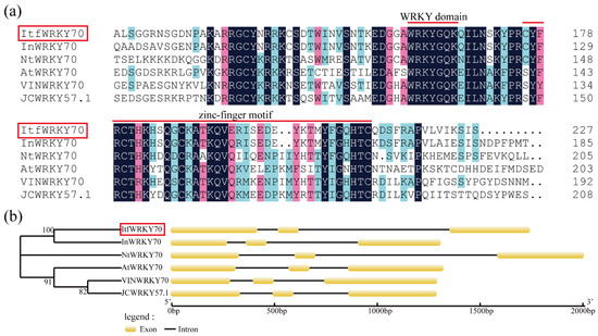 Sequence analysis of ItfWRKY70. (a) Multiple sequence alignment of the ItfWRKY70 protein and its closest homologs from different plant species. The WRKY domain and zinc-finger motif are represented with red lines. (b) Genomic structures of ItfWRKY70 and its closest homologs from different plants species. Exons are represented by ellipses, and introns are represented by lines.
