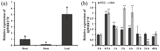 To investigate the potential working site of ItfWRKY70 in I. trifida, we analyzed its expression levels in different tissues, including the root, stem and leaf. The results showed that the ItfWRKY70 gene exhibited a higher expression level in the leaves of I. trifida than that in the stems and roots (Figure 2a). To further analyze its potential function, the expression of ItfWRKY70 was checked using the whole plants of 4-week-old I. trifida, grown in vitro, that were treated with 20% PEG6000 and 100 μM ABA for 0, 0.5, 1, 3, 6, 12, 24 and 48 h. These results showed that the expression of ItfWRKY70 was significantly induced by 20% PEG and ABA, and peaked at 0.5 h with 2.91-fold, and 3 h with 3.45-fold, respectively (Figure 2b).