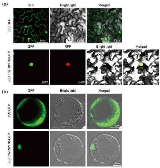 Subcellular localization of ItfWRKY70 was investigated by examining a ItfWRKY70-GFP fusion protein. The ORF of ItfWRKY70 controlled by the 35S promoter was fused with GFP, generating a fusion construct ItfWRKY70-GFP. The ItfWRKY70-GFP and red fluorescence protein (RFP)-NLS were transiently expressed in Nicotiana benthamiana leaf epidermal cells using Agrobacterium tumefaciens (A. tumefaciens)-meditated transformation. A nuclear localization signal (NLS) fused to an RFP protein was used in this study as a positive control. Confocal scanning microscopic images from Nicotiana benthamiana leaf epidermal cells showed that the green fluorescence emitted by ItfWRKY70-GFP was perfectly overlapped with the red fluorescence of RFP-NLS, indicating that ItfWRKY70 was localized in the nucleus (Figure 3a). We further analyzed the subcellular localization of the ItfWRKY70 in rice protoplasts, and the result was consistent with the above result (Figure 3b).