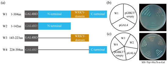 The pGBKT7-ItfWRKY70 fusion construct (W1), the pGBKT7 empty vector (as negative control), and the pGAL4 (as positive control) were separately transformed into the yeast strain AH109 (Figure 4a). Yeast cells containing any of the three vectors grew well on SD/-Trp medium; meanwhile, yeast cells containing W1 and pGAL4 vectors grew well on SD/-Trp/-His/X-α-Gal medium with α-galactosidase activity, whereas containing pGBKT7-empty vector did not grow (Figure 4b). To further analyze which region of ItfWRKY70 protein had the self-activation activity, different truncation construct vectors (W2: a WRKY domain and C-terminal deletion mutant, W3: an N-terminal and C-terminal deletion mutant, and W4: an N-terminal and WRKY domain deletion mutant) were separately transformed into the yeast strain AH109. Yeast cells containing the W4 and positive control grew well on SD/-Trp/-His/X-α-Gal (Figure 4c). These results indicated that deletion of the C-terminal of ItfWRKY70 resulted in loss of its self-transcriptional activation function. This result was consistent with the result of Li et al. [39].
