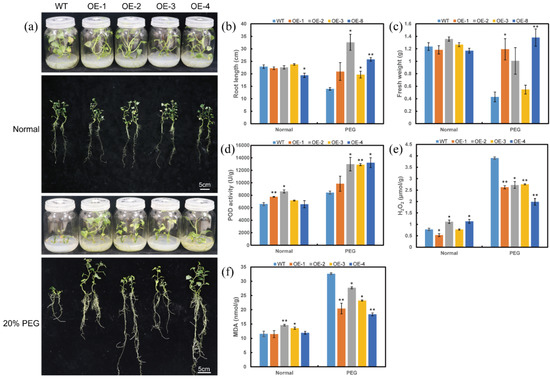Responses of transgenic and WT sweet potato plants cultured for 4 weeks on MS medium without stress (normal), or 20% PEG6000. (a) Phenotypes, (b) Root length, (c) Fresh weight, (d) POD activity in the transgenic and WT plants, (e) H2O2 content, (f) MDA content. Data are presented as the means ± SE (n = 3). * and ** indicate a significant difference compared to the WT at p < 0.05 and p < 0.01 based on Student’s t-test, respectively.