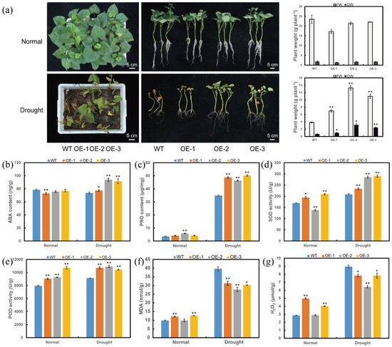 Responses of transgenic and WT sweet potato plants grown in a transplanting box with no stress (normal) and drought stress. (a) Phenotypes, FW and DW, (b) ABA content, (c) Proline content, (d) SOD activity, (e) POD activity, (f) MDA content, (g) H2O2 content. The phenotypes are shown after drought treatment for 6 weeks. FW, fresh weight; DW, dry weight. Data are presented as the means ± SE (n = 3). * and ** indicate a significant difference compared to the WT at p < 0.05 and p < 0.01 based on Student’s t-test, respectively.