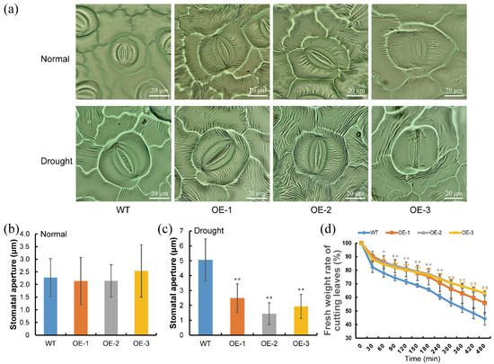 Stomatal aperture and water loss in transgenic lines and WT plants. (a) Observation of stomata in different plant leaves under normal and drought stress. (b,c) Stomatal apertures were measured using ImageJ software. (b) Normal condition and (c) Drought condition. Data are presented as the means ± SE (n > 40). (d) The fresh weight rate of cutting leaves in OE-1, -2, -3, and WT under dehydration treatment. Error bars represent sd (n = 3). p-values of significant difference of transgenic lines compared to the WT based on Student’s t-test, respectively (Supplementary Table S1). * and ** indicate a significant difference compared to the WT at p < 0.05 and p < 0.01 based on Student’s t-test, respectively.
