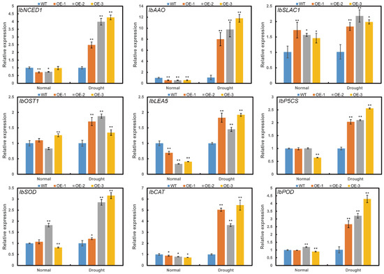 Expression levels of stress-responsive genes in transgenic and WT sweet potato plants. Plants grown in the transplanting boxes were sampled for analysis after treating with no stress (normal) for 4 weeks, drought stress for 4 weeks. Data are presented as the means ± SE (n = 3). * and ** indicate a significant difference compared to the WT at p < 0.05 and p < 0.01 based on Student’s t-test, respectively.
