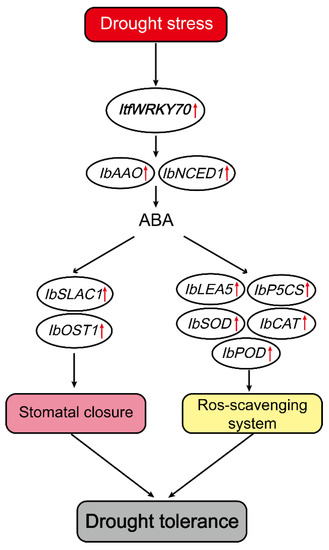 ABA acts as chemical signal and plays an important role in regulating the adaptive response of plants to abiotic stresses [44,45]. It has been reported that NCED1 and AAO are responsible for ABA accumulation [46]. Overexpression of CrNCED1 in transgenic tobacco displayed enhanced tolerance to drought stress via increasing ABA content [47]. ABA has been reported to regulate the expression levels of stress-tolerance-related genes, including P5CS, LEA, SOD, and POD, in several plant species [31,48,49,50]. Overexpression of FcWRKY70 conferred drought tolerance in tobacco (Nicotiana nudicaulis) and lemon (Citrus lemon) by reducing water loss and regulating the expression level of ADC [40]. The overexpression of MfWRKY70, a homology gene of ItfWRKY70, upregulated stress-associated genes (P5CS, NCED3 and RD29A), and maintained ROS homeostasis, leading to increased drought tolerance in transgenic Arabidopsis plants [41]. In this study, the expression of NCED1 and AAO involved in ABA synthesis and the content of ABA significantly increased in transgenic plants compared with WT under drought stress. The expression levels of P5CS and LEA was significantly up-regulated in transgenic plants (Figure 8). These results indicated that ItfWRKY70 might play an important role in the regulation of the stress-responsive gene via the ABA signaling pathway (Figure 9).