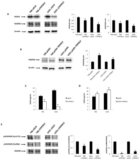 The VEGFA/VEGFR2 signaling pathway is implicated in proliferation, migration and angiogenesis [34,35,36]. Thus, the expression of VEGFA and VEGFR2 was analyzed at protein level in siGLO and siTRPML2 T98 and U251 cells by Western blot (Figure 1A). Silencing of TRPML2 inhibited VEGFA as well as VEGFR2 protein expression with respect to the control cells. On the other hand, an increased VEGFR2 protein expression was evidenced in enforced pCMV-TRPML2 compared with pCMV T98 and U251 cells (Figure 1B). In addition, the effect of TRPML2 expression modulation on VEGFA release was evaluated by ELISA. Reduced and enhanced VEGFA protein release at 24 h after transfection was evident in siTRPML2 vs. siGLO and pCMV-TRPML2 vs. pCMV T98 and U251 cells, respectively (Figure 1C).
