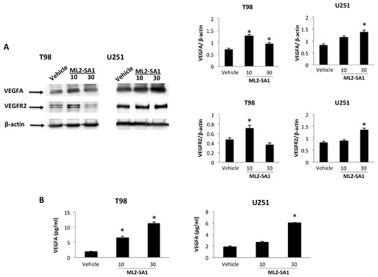 ML2-SA1 improves VEGFA and VEGFR2 proteins expression and increases VEGFA release in T98 and U251 cell lines. (A) Representative immunoblots reflecting VEGFA and VEGFR2 protein levels in vehicle- and ML2-SA1 (10 and 30 μM)-treated T98 and U251 cell lines. Blots are representative of one of three separate experiments. Densitometry values were normalized to β-actin, which was used as a loading control. Data are expressed as the mean ± SE of three separate experiments. * p < 0.05. (B) Levels of VEGFA release measured by ELISA were evaluated at 24 h in vehicle- and ML2-SA1 (10 and 30 μM)-treated T98 and U251 cell lines. Data are expressed as the mean ± SE of three separate experiments. * p < 0.05.