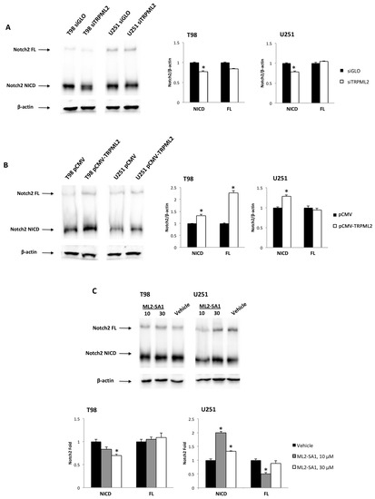 Expression of Notch2 protein in TRPML2 silenced or overexpressed and ML2-SA1 treated cell lines. Representative immunoblots reflecting Notch2 FL (full-length) and NICD (Notch intracellular domain) protein levels in siGLO and siTRPML2. (A) and in pCMV and pCMV-TRPML2. (B) T98 and U251 cell lines after 48 h post-transfection. (C) The Western blot analysis of Notch2 protein levels in T98 and U251 cell lines treated with vehicle or ML2-SA1 (10 and 30 μM) for 24 h. Blots are representative of one of three separate experiments. Densitometry values were normalized to β-actin, which was used as a loading control. Data are expressed as the mean ± SE of three separate experiments. * p < 0.05 siTRPML2 vs. siGLO cells, pCMV-TRPML2 vs. pCMV and ML2-SA1 vs. vehicle.