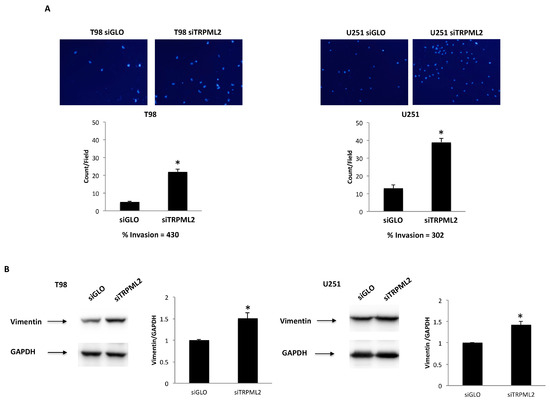 TRPML2 silencing increases the invasion capability in T98 and U251 cell lines. (A) Representative images showing DAPI fluorescence after 24 h culture in Transwell chambers (×10 magnification). The siGLO and siTRPML2 T98 and U251 invading cells were counted in 10 randomly chosen microscopic fields per transwell. Each sample was run in triplicate, and three independent experiments were performed. Bars represent the quantification of invaded cells in each field (Mean ± SE), * p < 0.01. (B) Representative immunoblots reflecting vimentin protein levels in siGLO and siTRPML2 T98 and U251 cell lines. Blots are representative of one of three separate experiments. Densitometry values were normalized to GAPDH, which was used as a loading control. Data are expressed as the mean ± SE of three separate experiments. * p < 0.05.