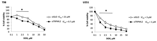 TRPML2 silencing affects the DOX resistance in T98 and U251 cell lines. Cell cytotoxicity was evaluated by 3-(4,5-dimethylthiazol-2-yl)-2,5-diphenyltetrazolium bromide (MTT) assay in siGLO and in siTRPML2 T98 and U251 cell lines, treated with DOX at different doses for 24 h. Data shown are expressed as the mean ± SE of three separate experiments. * p < 0.05 siTRPML2 vs. siGLO.