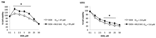 ML2-SA1 treatment affects the DOX (Doxorubicin)-resistance in T98 and U251 cell lines. Cell cytotoxicity was evaluated by 3-(4,5-dimethylthiazol-2-yl)-2,5-diphenyltetrazolium bromide (MTT) assay in glioma cell lines, treated with DOX at different doses for 24 h after the pretreatment with ML2-SA1 for 6 h. Data shown are expressed as the mean ± SE of three separate experiments. * p < 0.05.