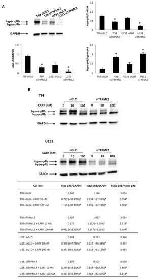 Herein, the effects of TRPML2 silencing in T98 and U251 cells on the pRB expression and activation were evaluated in siTRPML2 and siGLO T98 and U251 cells. We found that TRPML2 knock-down in glioma cells reduces total pRB1 as well as the active/hypophosphorylated form levels, compared with siGLO T98 and U251 cells. Additionally, the hypo/hyperphosphorylated pRB protein ratio was increased (Figure 7A).