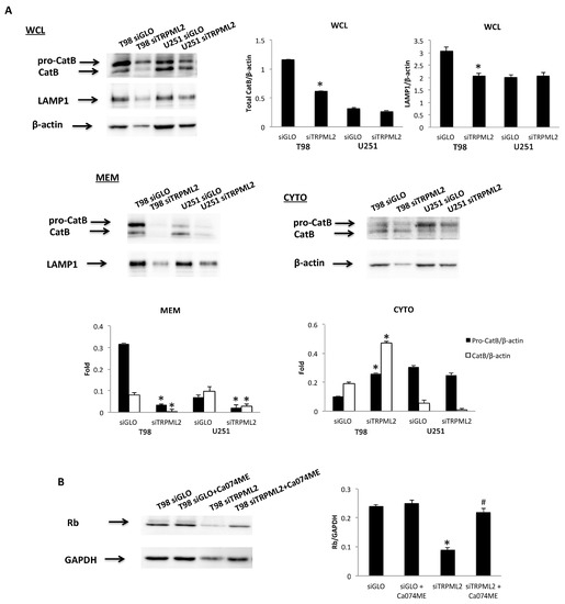 A role of the knock-out of TRPML channels in Cathepsin B (CatB) maturation and release [43] as well as the sensitivity of pRB to CatB-like degradation [44] was demonstrated; therefore, the CatB involvement in TRPML2-mediated effects has been evaluated. CatB localization in siTRPML2 and siGLO T98 and U251 cells was established using a subcellular fractionation protocol. Immunoblots showed that although the pro-CatB and the mature CatB protein levels were reduced in total and membrane fractions in both siTRPML2 T98 and U251 cells, compared with siGLO cells, the cytosolic CatB levels in T98, but not U251 siTRPML2 cells, were significantly increased, compared with siGLO T98 cells (Figure 8A).