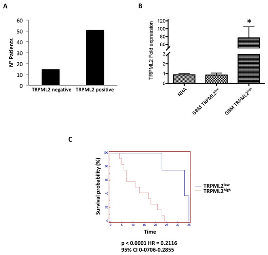 TRPML2 overexpression correlates with poor prognosis in GBM patients. (A) Number of patients TRPML2 negative and TRPML2 positive. (B) The relative TRPML2 mRNA expression in normal human astrocyte (NHA), and GBM samples expressing low (n = 18) or high (n = 33) TRPML2 was evaluated by qRT-PCR. TRPML2 mRNA levels were normalized for GAPDH expression. Data are expressed as the mean ± SD. * p < 0.01 vs. NHA and TRPML2 low samples. (C) Kaplan–Meier plot for GBM patients in TRPML2low and TRPML2high subgroups. p < 0.0001.