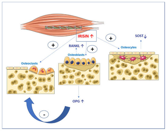 Inflammatory bowel disease (IBD) is characterized by chronic inflammation of the intestine and gastrointestinal disorders; the most common forms of IBD are Crohn’s disease (CD) and ulcerative colitis (UC) [74]. Patients with IBD suffer not only from intestinal pathology but also from multiple comorbidities induced by extraintestinal inflammation. Malnutrition, vitamin D deficiency, reduced physical activity, hypogonadism, delayed puberty, inflammation, and corticosteroid use are common findings in patients with IBD and, in turn, may negatively impact the skeletal system [75]. Indeed, IBD causes osteopenia, osteoporosis, and a subsequently high fracture risk [76,77]. In these patients, the bone microstructure is damaged. Inflammation generates a decrease in bone mass because it increases osteocyte protein expression and osteoclast activity; it also increases the expression of the receptor activator of NF-kB ligand (RANKL), TNF-a, and IL-6, which are factors implicated in IBD and known to stimulate bone resorption [78]. However, it is not known whether the immunological processes that drive bone loss in IBD are distinct from or parallel to those in the intestine. There is currently no cure for chronic IBD, so all efforts are being made for treatments aimed at mitigating the symptoms of the disease [79]. Given the emerging anti-inflammatory role of irisin, a recent study examined how exogenous treatment with irisin might improve disease status in a rat model of TNBS-induced chronic IBD [80]. This rat model is characterized by morphological and functional changes in the gut that occur in parallel in the bone, with increased bone resorption and decreased bone formation. Results showed that exogenous treatment with irisin blocked the gut from inflammatory changes, improved lymphatic structure, and recovered bone turnover by reducing TNF-a and RANKL [80], thus proposing irisin as a promising clinical approach in chronic inflammatory conditions [80]. Although information on irisin and IBD in humans is currently unknown, it is well recognized that moderate exercise may exert an ameliorative effect in this disease. Crohn’s disease patients who exercised were significantly less likely to develop active disease after six months. In addition, moderate exercise was shown to exert a positive effect on weight maintenance and delay of osteoporosis in patients with IBD [81]. Conversely, it is known that, depending on its intensity and duration, exercise can cause mild transient systemic inflammation and increases the release of pro-inflammatory cytokines, thereby exacerbating gastrointestinal symptoms. Therefore, studies correlating serum irisin levels with inflammatory cytokines in IBD are not only desirable but also urgent since physical activity is one of the strongly recommended nonpharmacological therapies for the mental and physical well-being of these patients.