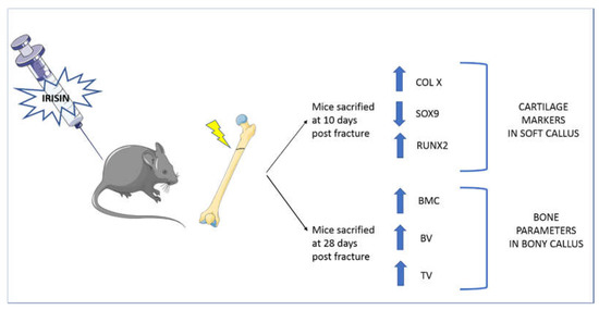 - Colucci, S.C.; Buccoliero, C.; Sanesi, L.; Errede, M.; Colaianni, G.; Annese, T.; Khan, M.P.; Zerlotin, R.; Dicarlo, M.; Schipani, E.; et al. Systemic Administration of Recombinant Irisin Accelerates Fracture Healing in Mice. Int. J. Mol. Sci. 2021, 22, 10863. [Google Scholar] [CrossRef]