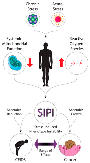 A diagram of the hypothetical mechanisms and effects of stress-induced phenotype instability in cancer and CFS/ME. Various forms of acute stress (such as radiation exposure or infection) or chronic stress may contribute to the systemic dysregulation of energy metabolism and upregulation of oxidative stress. These factors may promote stress-induced phenotype instability in patients, where down- or up-regulation of metabolic pathways could contribute to energy deficits or growth, leading to fatigue symptoms in cancer and CFIDS patients.
