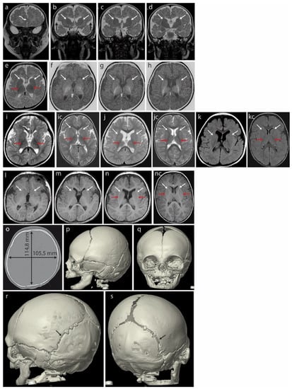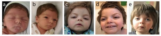 - Verloes, A.; Di Donato, N.; Masliah-Planchon, J.; Jongmans, M.; Abdul-Raman, O.A.; Albrecht, B.; Allanson, J.; Brunner, H.; Bertola, D.; Chassaing, N.; et al. Baraitser-Winter cerebrofrontofacial syndrome: Delineation of the spectrum in 42 cases. Eur. J. Hum. Genet. 2015, 23, 292–301. [Google Scholar] [CrossRef]