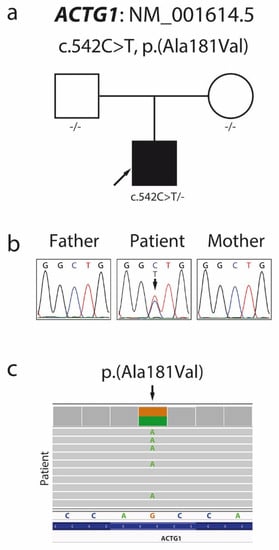 - Rivière, J.B.; van Bon, B.W.; Hoischen, A.; Kholmanskikh, S.S.; O’Roak, B.J.; Gilissen, C.; Gijsen, S.; Sullivan, C.T.; Christian, S.L.; Abdul-Rahman, O.A.; et al. De novo mutations in the actin genes ACTB and ACTG1 cause Baraitser-Winter syndrome. Nat. Genet. 2012, 44, 440–444. [Google Scholar] [CrossRef] [PubMed] [Green Version]