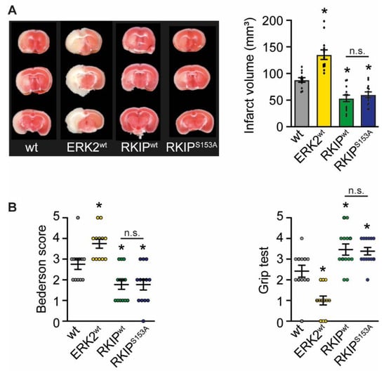 Overexpression of ERK2wt increases infarct size and neurological deficits whereas RKIPwt and RKIPS153A show opposite effects 24 h after induction of stroke. Characterization of wild-type (wt) mice (n = 12), mice with ubiquitous overexpression of ERK2wt (ERK2wt; n = 12), RKIPwt (RKIPwt; n = 13), or a phosphorylation-deficient mutant of RKIPS153A (RKIPS153A; n = 13) 24 h after induction of stroke by transient middle cerebral artery occlusion. (A) Analysis of infarct volume by 2,3,5-triphenyltetrazolium chloride (TTC) staining. Left: Representative TTC stained coronal brain sections. Right: Quantification of infarct volume. (B) Analysis of neurological functions using Bederson score and grip test. Error bars are mean ± SEM; n represents the number of animals. * p < 0.05 versus wt. n.s.—Not significant.