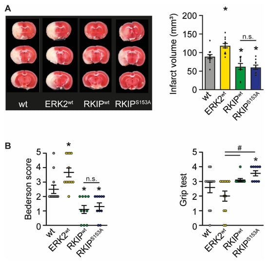 Overexpression of ERK2wt increases infarct size and neurological deficits whereas RKIPwt and RKIPS153A show opposite effects three days after tMCAO. Characterization of wild-type (wt) mice, mice with ubiquitous overexpression of ERK2wt (ERK2wt), RKIPwt (RKIPwt), or a phosphorylation-deficient mutant of RKIPS153A (RKIPS153A) three days after induction of stroke by transient middle cerebral artery occlusion. (A) Analysis of infarct volume by 2,3,5-triphenyltetrazolium chloride (TTC) staining. Left: Representative TTC stained coronal brain sections. Right: Quantification of infarct volume (wt, ERK2wt: n = 12; RKIPwt, RKIPS153A: n = 10). (B) Analysis of neurological functions using Bederson score (wt, ERK2wt: n = 12; RKIPwt, RKIPS153A: n = 10) and grip test (wt, ERK2wt: n = 12; RKIPwt: n = 10; RKIPS153A: n = 9). Error bars are mean ± SEM; n represents the number of animals. * p < 0.05 versus wt. # p < 0.05 versus the indicated group. n.s.—Not significant.
