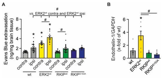 Disruption of the BBB is one of the consequences in response to cerebral ischemia. Endothelial cells are damaged and secrete the vasoconstrictive endothelin-1 that is associated with a poor prognosis after stroke []. The instability of the BBB subsequently leads to the formation of edema that cause further deterioration [,]. We therefore evaluated the effects of ERK2wt, RKIPwt, and RKIPS153A overexpression on BBB function to see if it is responsible for the observed functional outcome/phenotype. Leakage of the BBB was determined by measuring the extravasation of the vascular tracer Evans Blue into the brain parenchyma. After stroke, ERK2wt mice showed a significant increase in Evans Blue extravasation into the ipsilateral hemisphere compared to wt mice (Figure 3A). Of note, the leakage of the BBB in ERK2wt mice even affected the contralateral hemisphere. The stability of the BBB in RKIPwt and RKIPS153A mice was comparable to the wt controls. In line with these findings, mRNA expression levels of endothelin-1 were upregulated in ERK2wt compared to wt and RKIP-tg mice (Figure 3B). Thus, disruption of the BBB seems to contribute to the detrimental phenotype of ERK2wt overexpression. However, the protective effects of RKIP on the infarct size and neurological functions cannot be explained by a prevention of the BBB leakage.