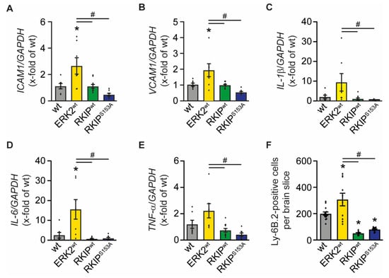 Besides leakage, adhesion proteins such as intercellular adhesion molecule 1 (ICAM1) or vascular adhesion molecule 1 (VCAM1) also change within the BBB after stroke. These proteins are responsible for the anchorage and infiltration of inflammatory cells and contribute to the deterioration after stroke [,,,]. Indeed, mRNA expression levels of ICAM1 and VCAM1 were significantly elevated in ERK2wt mice in comparison to non-transgenic littermates, while the expression levels of these genes were indistinguishable from wt levels in RKIP mice (Figure 4A,B).