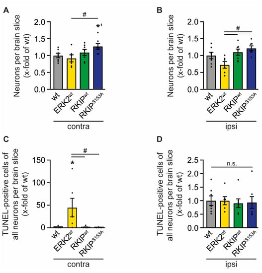 ERK2wt overexpression promotes neuronal death. Wild-type mice (wt), mice with ubiquitous overexpression of ERK2wt (ERK2wt), RKIPwt (RKIPwt), or a phosphorylation-deficient mutant of RKIPS153A (RKIPS153A) were subjected to 45 min of transient middle cerebral artery occlusion (tMCAO). Twenty-four hours after induction of stroke by tMCAO, brain sections were incubated with NeuN to stain neurons in the contralateral (contra; wt, RKIPwt, RKIPS153A: n = 7; ERK2wt: n = 6) (A) and ipsilateral (ipsi; wt, RKIPwt, RKIPS153A: n = 7; ERK2wt: n = 6) (B) hemisphere and co-stained with TUNEL-reagent to analyze apoptotic neurons in the contralateral (contra; n = 6) (C) and ipsilateral (ipsi; wt, RKIPwt, RKIPS153A: n = 7; ERK2wt: n = 6) (D) hemisphere. Error bars are mean ± SEM; n represents the number of animals. * p < 0.05 versus wt in an ANOVA test. *1 p < 0.05 versus wt in a t-test. # p < 0.05 versus the indicated group. n.s.—Not significant.