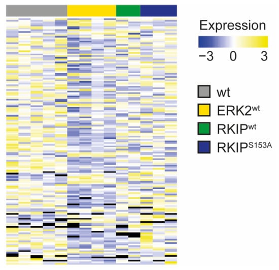 ERK2wt overexpression induces the biggest changes compared to wild-type controls, whereas RKIP overexpression was similar to wild-type. Mass spectrometric analysis of proteins in the ipsilateral basal ganglia of wild-type mice (wt, n = 5), mice with ubiquitous overexpression of ERK2wt (ERK2wt, n = 4), RKIPwt (RKIPwt, n = 2), or a phosphorylation-deficient mutant of RKIPS153A (RKIPS153A, n = 3) 24 h after induction of stroke by transient middle cerebral artery occlusion. Heat map visualization of the significantly regulated proteins between wt and ERK2wt. Black bars indicate missing data. For protein list and individual values, refer to Table S5.