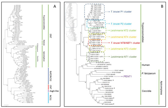 Phylogenetic tree of nucleoside and nucleobase transporters, constructed from a Clustal Omega amino acid multiple alignment by a Maximum Likelihood analysis in Mega-X (500 bootstraps). (A) Overview of division into different gene families. (B) Zoom-in on the ENT (SLC29) gene family, highlighting some well-characterised transporters. All sequences are listed in Supplemental Table S4. * highlights the position of the T. gondii ENT transporters.