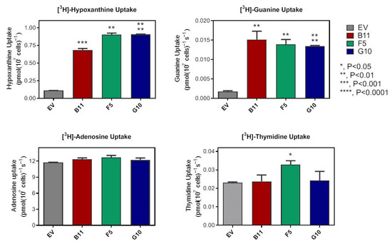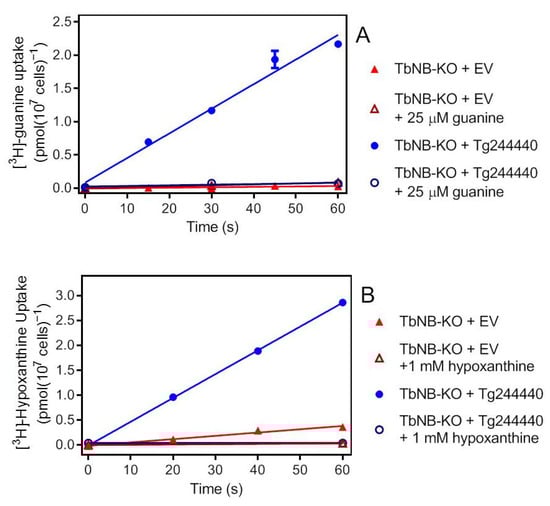 Hypoxanthine uptake was very similar to that of guanine: linear over 60 s, saturable, and with a significantly non-zero rate (Table 1). The slope of the EV control was also non-zero, as previously reported [32] but 86.2% lower than the +Tg244440 clone F5 (p < 0.0001) (Figure 3B). We conclude that Tg244440 efficiently transports guanine and hypoxanthine but at best marginally transports thymidine, while no conclusion on adenosine uptake could be reached.