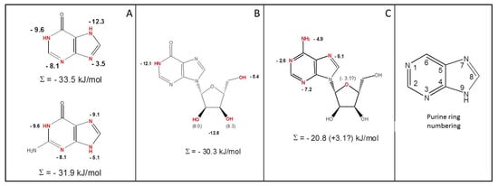 Substrate binding models for Tg244440. (A) Hypoxanthine (top) and guanine (bottom). (B) Inosine. (C) Adenosine. Inset: numbering of purine ring positions. Oval dashed lines represent proposed bonds, presumed to be hydrogen bonds; the numbers given with them are the estimated Gibbs free energy of interaction, in kJ/mol.