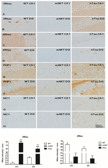 Representative images of 3Rtau (A,B), 4Rtau (C,D), PHF1 (E,F), and MC1 (G,H) expression in the CA1 region of the hippocampus and dentate gyrus (GD) in WT, mtWT, and hTau at the age of 9 months. In hTau mice, 3Rtau predominates, whereas only 4Rtau is expressed in WT mice. Weak PHF1 immunoreactivity occurs in the neuropil in WT, but PHF1-immunoreactive neurons are only seen in hTau mice. MC1 antibodies decorate weak globular cytoplasmic deposits in a subpopulation of neurons in hTau mice. MC1 is negative in WT. As expected, immunohistochemistry with antibodies against 3Rtau, 4Rtau, PHF1, and MC1 is negative in mtWT transgenic mice. Paraffin sections with slight haematoxylin counterstaining, bar = 50 µm. Graphs show quantitative densitometry for anti-3Rtau and anti-4Rtau immunostaining expressed as a percentage of arbitrary units per area in CA1 and dentate gyrus (DG) regions in WT, mtWT, and hTau mice. Results were analyzed with one-way ANOVA and post hoc Tukey. Differences between groups were considered statistically significant at *** p < 0.001 when comparing hTau with WT, and ### p < 0.001 when comparing htau with mtWT. Note that 4Rtau is predominant in WT mice, excepting the DG in which 3Rtau positive neurons are also localized in the inner layer. In contrast 3Rtau predominates in CA1 and DG in hTau transgenic mice.