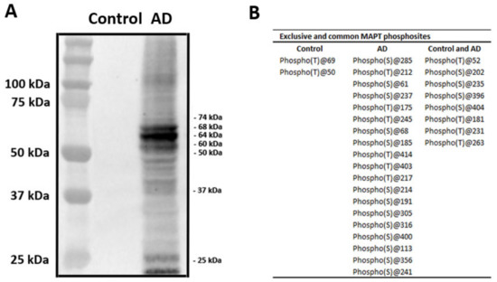 Characteristics of sarkosyl-insoluble fractions. (A) Sarkosyl-insoluble fractions of AD brain homogenates blotted with anti-tauSer422 were characterized by three bands of 68 kDa, 64 kDa, and 60 kDa, a weak upper band of 73 kDa, and several lower bands of fragmented tau between 50 and 25 kDa. Lower bands stained with anti-tauSer422 show truncated tau at the C-terminal. Sarkosyl-insoluble fractions of the control case blotted with the same antibody are negative. The first lane on the left shows the molecular weight of the crude markers. (B) Table showing the phosphorylation sites in tau from sarkosyl-insoluble fractions of AD and control homogenates revealed by (phospho)proteomics. The phosphorylation site is labeled with T for threonine and S for serine. The table shows two phosphorylation sites in tau found only in the control; nineteen phosphorylation sites found only in AD; and eight phosphorylation sites which were common to control and AD. (phospho)proteomics was used to learn about the molecular composition of sarkosyl-insoluble fractions in AD and control cases. Twenty-seven phosphorylated tau sites were identified in AD, and ten phosphorylated tau sites in the control; eight phosphosites were shared by AD and control homogenates (B).
