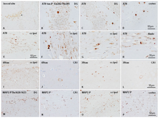 WT mice unilaterally inoculated with AD sarkosyl-insoluble fractions in the hippocampus gyrus at six months and killed at nine months (three months of survival) showed abnormal tau deposition, as revealed with the antibody AT8, in neurons of the dentate gyrus, cerebral cortex near the site of inoculation, CA1 region of the hippocampus, and threads and glial cells in the fimbria and ipsilateral corpus callosum (Figure 4B–E). Deposits in glial cells in the corpus callosum and fimbria were better visualized at higher magnification (Figure 4 F–H). Abnormal deposits were stained with anti-4Rtau (Figure 4I, J), and 3Rtau antibodies (Figure 4K,L). Abnormal deposits were also strongly immunostained with anti-MAP2-P Thr1620/1623 antibodies (Figure 4M–P). Tau deposits were not stained with antibodies Tau-P Ser422, PHF1, Tau-N Tyr29, MC1, MAP2-P Thr1620/1623, or casein kinase δ (data not shown). Expression of active (phosphorylated) kinases p38-P and SAPK/JNK-P was observed in phospho-tau deposits in inoculated WT mice, as reported elsewhere [22,23,24,25,26]. However, GSK-3βP Ser9, AKT-P Ser473, and PKA α/β-P Tyr197 immunoreactivity was absent (images not shown).