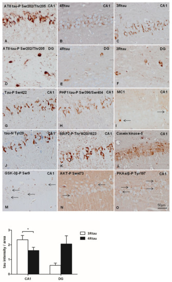 hTau transgenic mice unilaterally inoculated in the hippocampus with sarkosyl-insoluble fractions from AD homogenates at the age of six months and killed at the age of nine months show abundant abnormal deposits in the CA1 region of the hippocampus (CA1) and dentate gyrus (DG). AT8-immunoreactive deposits are seen in CA1 region (A), and dentate gyrus and hilus (D). Tau deposits are stained with anti-4Rtau antibodies (B,E), and more strongly with anti-3Rtau antibodies (C,F). Phospho-tau deposits in hTau transgenic mice are dense and flame-shaped, reminiscent of neurofibrillary tangles. Immunoreactivity to tau-P Ser422, PHF1, MAP2-P, and tau-N Tyr29 is strongly positive (G, H, K and J, respectively). MC1 immunoreactivity is restricted to a few neurons (I); in this field, one neuron has small granular deposits (right arrow) and the other a dense round inclusion (left arrow). CK1-δ (L), GSK-3β-P Ser9 (M), AKT-P Ser473 (N), and PKAα/β-P Tyr197 (O) granular immunoreactivity (arrows) appears in affected neurons in inoculated hTau mice. Sections are consecutive and obtained from the same inoculated hTau mouse. Paraffin sections slightly counterstained with haematoxylin, bar = 50 µm. The graph shows quantitative densitometry for anti-3Rtau and anti-4Rtau staining expressed as a percentage of arbitrary units per area in CA1 and dentate gyrus (DG) regions in inoculated hTau mice surviving six months after injection. Results were analyzed with Student’s t-test. Differences between anti-3Rtau and anti-4Rtau staining within the same region in consecutive slices were considered statistically significant at * p < 0.05.