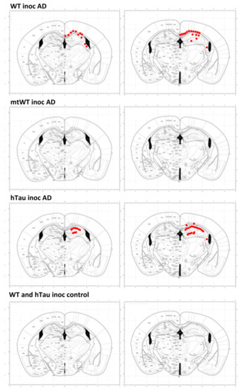 The distribution of abnormal tau deposits in WT, mtWT, and hTau unilaterally inoculated in the hippocampus with the same inocula of sarkosyl-insoluble fraction of AD and WT, and hTau inoculated with sarkosyl-insoluble fractions from one control brain. Mice were inoculated at the age of six months and killed at the age of nine months. Red points are tau deposits representative of deposits depicted in Figure 4 and Figure 5. Tau deposits are not detected in mtWT inoculated with AD sarkosyl-insoluble fractions. In contrast, Tau deposits are found in WT and hTau inoculated with AD sarkosyl-insoluble fractions. Tau deposits in CA1 region and dentate gyrus are more abundant in inoculated hTau mice when compared with WT mice. Tau deposits in the stratum radiatum and stratum oriens are also more abundant in hTau than in WT mice. In contrast, tau deposits in the corpus callosum and fimbria (involving glial cells) are more copious in inoculated WT mice. No abnormal tau deposits are detected in WT and hTau mice inoculated with sarkosyl-insoluble fractions from a control case. The maps were obtained from the Atlas of Paxinos and Franklin [29] and represent two different coronal levels to facilitate the extent of tau deposits considering the three axes; sections of the left column are more anterior than the sections of the right column.